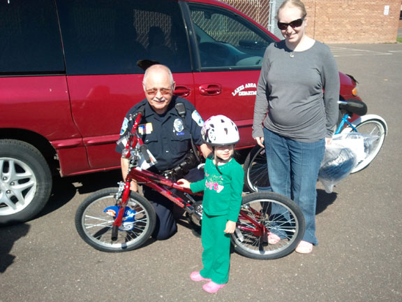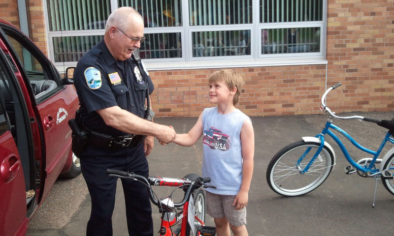 bicycle winner at lakeside School. (L to R) Lakes Area Police Officer